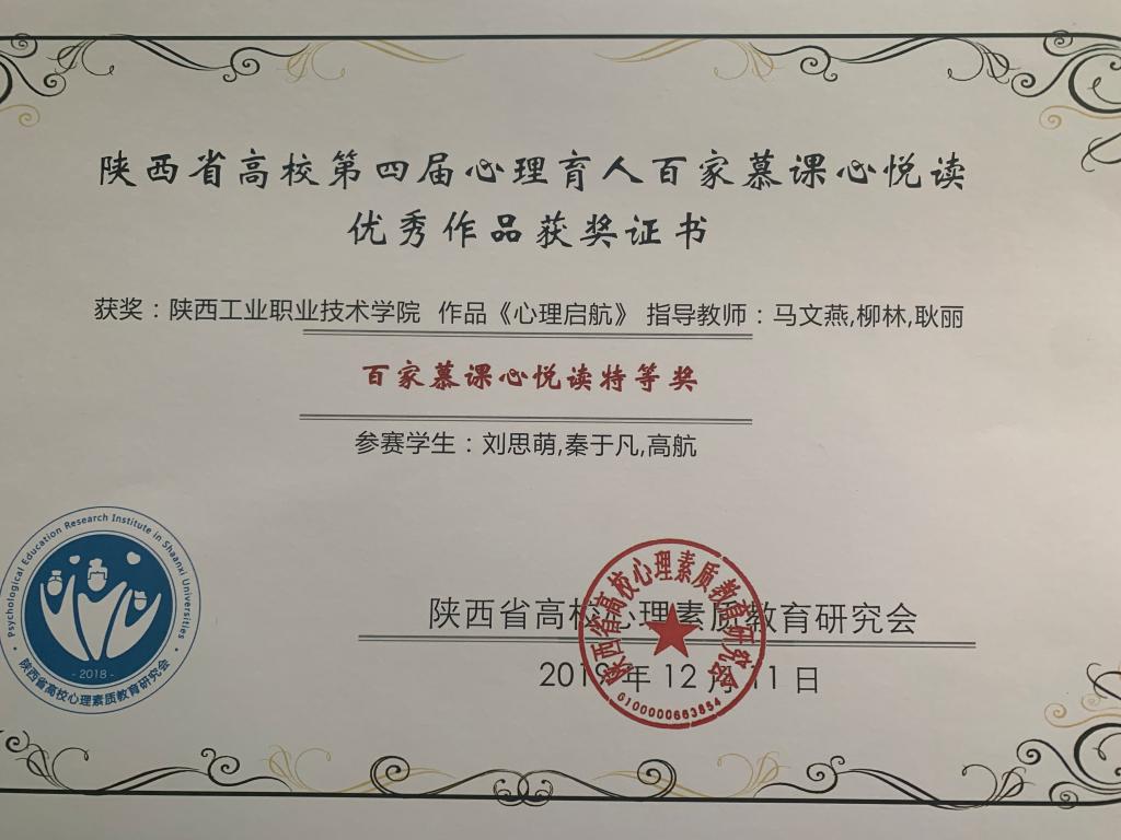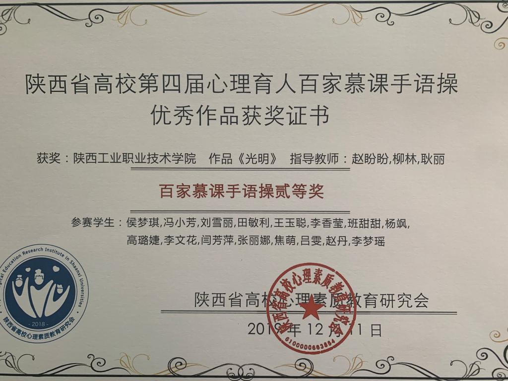 为贯彻省教工委心理育人工作部署,加强高校心理健康教育工作,陕西省高校心理健康教育研究会开展了“第四届陕西省高校心理育人百佳慕课学生作品”推选活动。我院学生处心理咨询中心通过前期广泛动员、精心指导、选拔推荐的参赛作品在本次表彰中获佳绩。其中,由大学生心理健康协会会员刘思萌等同学参赛的“心悦读”作品《心理起航》荣获特等奖,由大学生心理健康协会会员侯梦琪等同学参赛的“手语操”作品《光明》荣获二等奖,马文燕、赵盼盼、柳林、耿丽四位老师分获优秀指导老师奖。