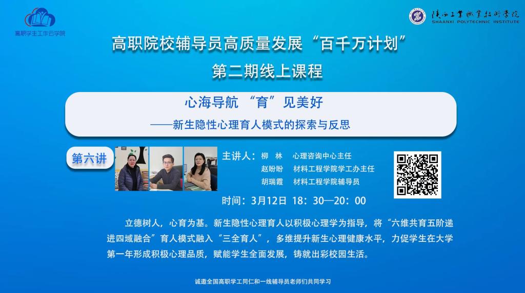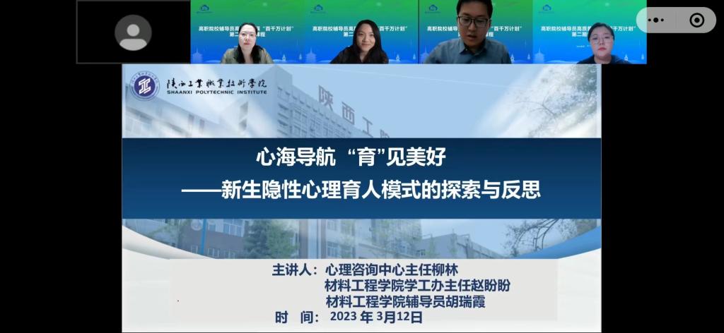 近日,高职院校辅导员高质量发展“百千万计划”在线上平台如期举行,我校作为第二期线上课程的主讲团队之一,首次向全国学生工作团队分享学生心理健康工作的相关经验,展示风采。该活动由“天下学工群委会”组织,浙江金融职业学院的承办,我校学生处和材料工程学院组成主讲团参与经验分享。