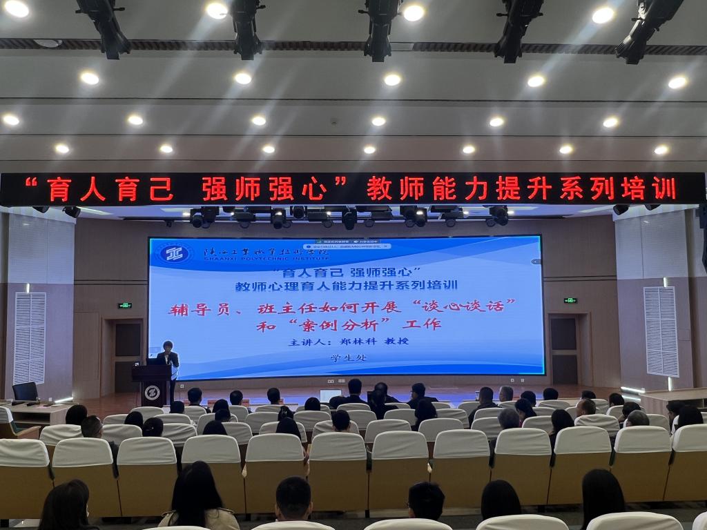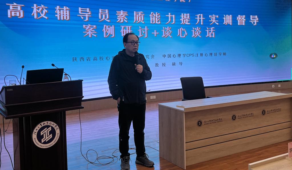 为进一步推进我校学生工作队伍专业化建设,提升辅导员、班主任心理育人和谈心谈话能力,5月11日上午,学生处心理咨询中心特邀陕西省心理素质教育研究会会长、辅导员素质能力大赛评审专家郑林科教授在渭城校区学术会堂为我校作“高校辅导员素质能力提升实训督导 案例研讨+谈心谈话”专题培训。各二级学院党总支书记、学工办主任、全体辅导员、班主任、及心理健康教育全体专兼职教师等100余人参加培训,本次培训由学生处副处长耿丽主持。