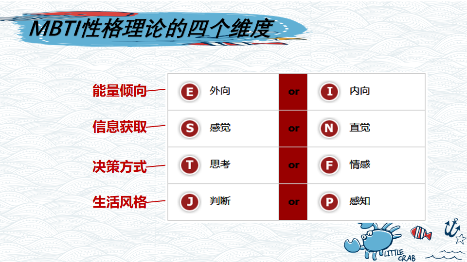 Myers-Briggs Type Indicator(MBTI指标)是从荣格的性格分类理论发展而来,并由美国一对母女心理学者制定的性格测试指标,分为4个维度,每个维度2个类型倾向,每个类型倾向用一个字母表示。在每个维度上,人的倾向未必非黑即白,只是离哪个倾向更靠近一些。