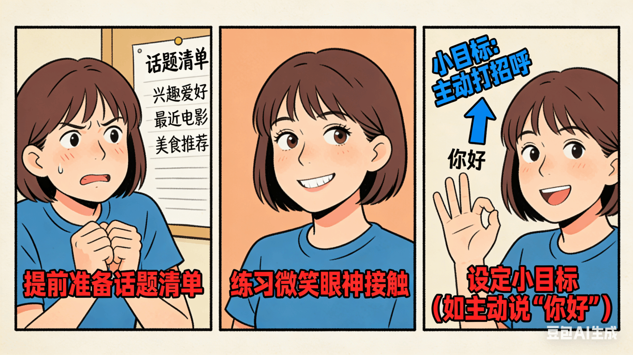 针对大学生常见的社交场景,分享四个 “阶梯式自救法”,从易到难逐步突破: