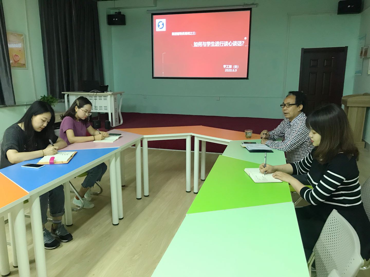 为不断加强我校辅导员队伍建设,帮助新进辅导员尽快熟悉学生管理工作,提升辅导员的基本素质、工作能力和业务水平,进而更好地服务学生思想政治教育和成长成才,2020年6月9日下午,在学工部(处)的安排下,学生教育管理科在格物楼心理团辅室对新进辅导员进行了第三次岗前培训。会议由王老师主持。
