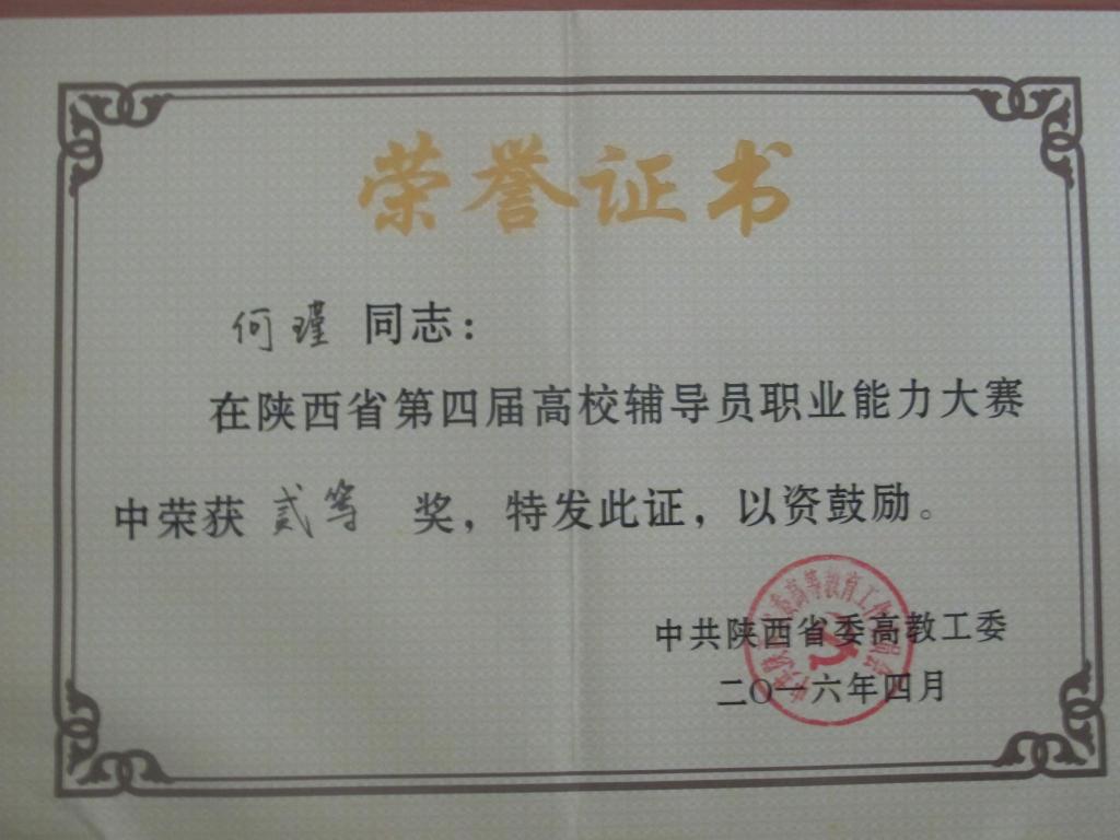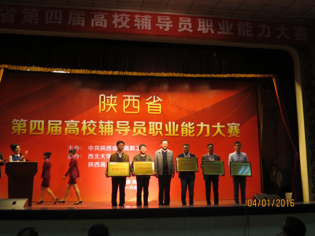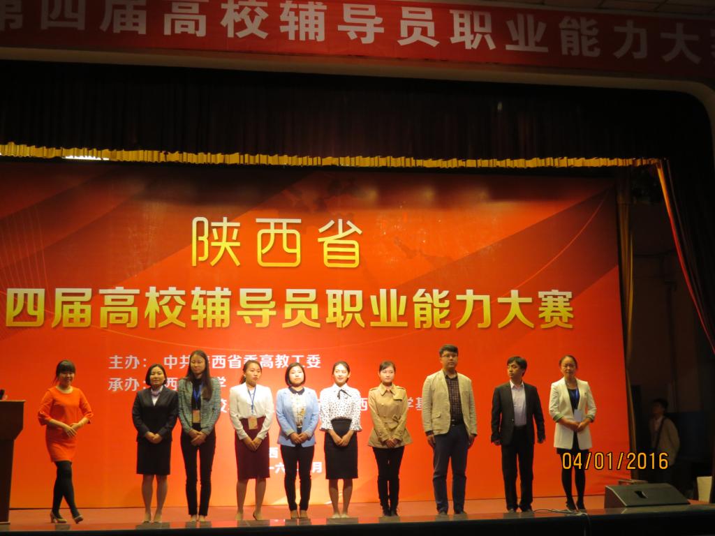 中共陕西省委高教工委于今年1月组织开展第四届全国高校辅导员职业能力大赛, 经过各高校内部选拔,共有来自全省高校的125名辅导员参加比赛。我校也高度重视,学工部严密组织校内大赛,历经一个月的层层选拔,何瑾以校内一等奖的成绩晋级参加省级大赛。由学工部牵头,根据5个环节的需要成立5个小组,进行针对性强化训练。在3月31、4月1日两天的比赛中,通过基础知识测试和博文写作、主题班会、案例分析、主题演讲、谈心谈话等5个环节的激烈角逐,何瑾凭借扎实的理论功底、丰富的工作经验、过硬的职业能力和良好的心理素质,一路过关斩将,荣获二等奖,也成为我校在此项比赛中获得的最好成绩。