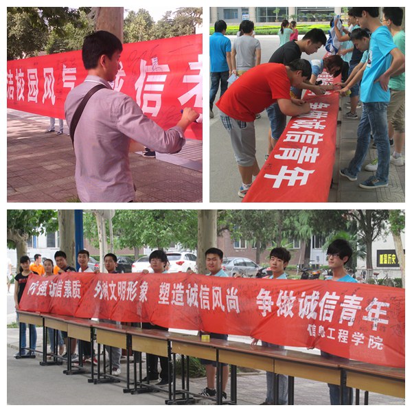 十个二级学院积极配合,学生积极参与,在全院开展了主题班会、发放诚信问卷调查、主题演讲会、签订诚信承诺书、诚信格言、诚信誓词征集活动、诚信文明宿舍评比、诚信签名、观看感恩教育视频、学习中共中央国务院《关于进一步加强和改进大学生思想政治教育的意见》、我院大学生手册中《大学生诚信度考核办法》、《助学贷款前诚信教育辅导材料》,解读高校家庭经济困难学生资助政策及《诚信与感恩》手册等等内容丰富、形式多样的诚信感恩主题教育活动。
