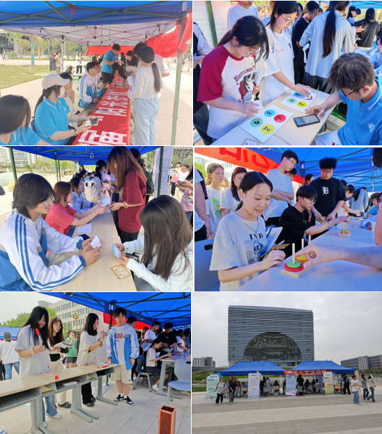 活动现场设有“签到打卡区”“心灵解密区”“作品展示区”“君子六艺活动区”四大活动区域。在“签到打卡区”设置有签名横幅与“请和我击掌”,同学们通过签名或画手印的方式完成签到,并领取“通关文牒”以便进行后续活动;在“心灵解密区”,为同学们设置了专业的心理测评问卷,并有专业老师在场讲解,帮助同学们正确客观地认识自我,同时为大家发放了心理知识手册、心海阳光报等宣传品;“作品展示区”设有二级学院“一站一品”展示区与心理咨询中心手工艺作品展示区两大区域,展示了我校第九届“阳光护航”心理育人季系列实践活动中的部分优秀心理作品,同学们通过展示富有创意且手工制作的风筝、香包、剪纸、团扇、手工扎染、书画作品、摄影作品以及精巧的手工艺作品,来表达自己内心的真情实感;在“君子六艺活动区”,设置了“礼”(平移古塔)、“乐”(抗干扰节奏训练)、“射”(投壶)、“御”(同舟共济)、“书”(趣味断句数)、“数”(九曲迷宫)六个传统文化心理游戏活动,让师生在参与游戏的过程中进一步了解传统文化,并在游戏体验中放松身体,净化心灵。