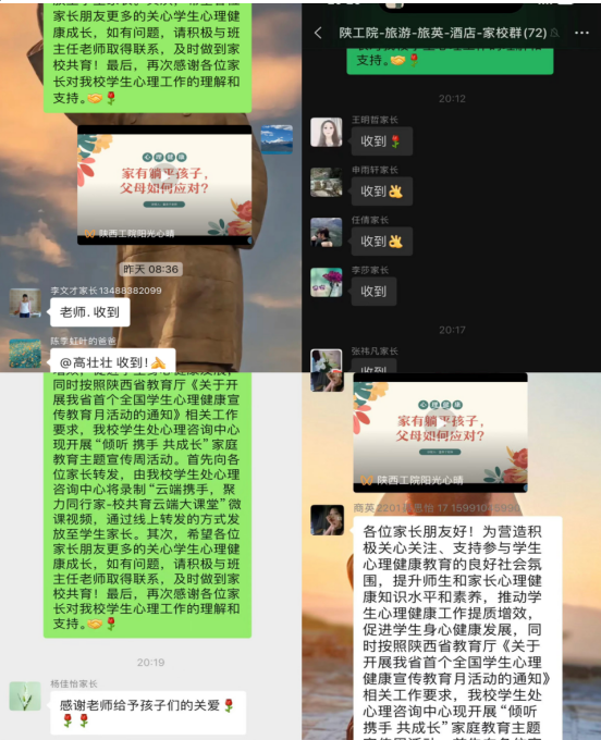 家庭教育主题宣传周期间,学生处心理咨询中心录制“云端携手,聚力同行家-校共育云端大课堂”两节微课视频,各二级学院通过线上转发的方式发放至我校学生家长,视频累计播放量达万余人次。同时,各二级学院围绕“倾听 携手 共成长”主题,通过主题班会、公众号科普、微视频录制、心理征文、电话家访等方式积极开展了本次家庭教育主题宣传周活动。