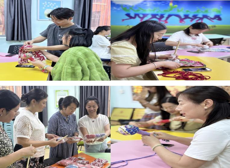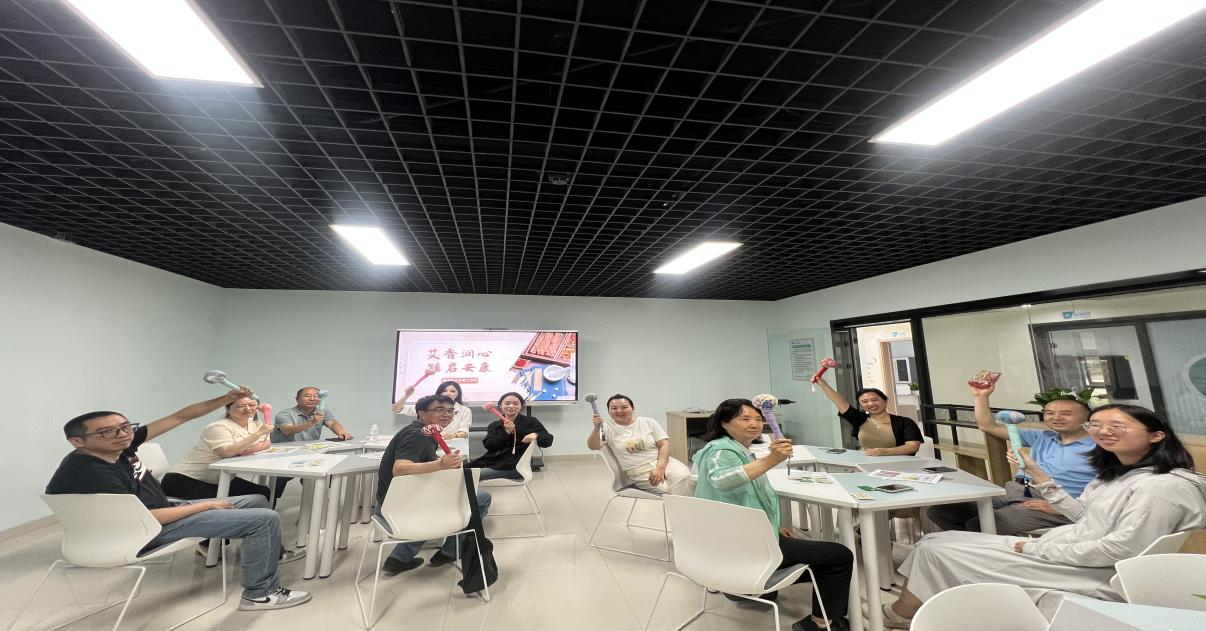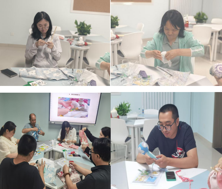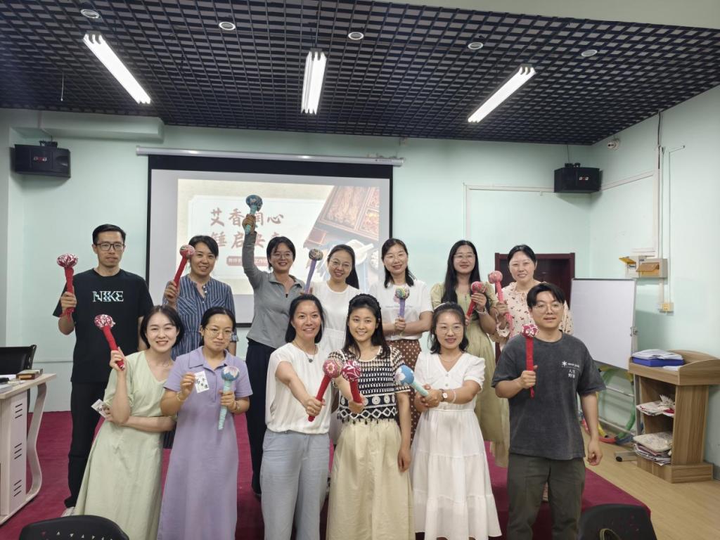 端午插艾,既是祛邪避秽的民俗,更是古人“以草养心”的智慧。活动伊始,董老师以端午挂艾的传统习俗为切入点,结合中医理论阐释艾草“温经通络、安神助眠”的药用价值。手工制作环节,棉布、艾草绒、彩绳、流苏等材料整齐陈列,教师们围坐案前,参照步骤图穿针引线、精心缝制。裁剪布料的沙沙声、缠绕彩绳的窸窣声与轻声交流交织,形成舒缓的疗愈背景音。经过近一小时的专注手作,一柄柄缀着五彩流苏、散发淡淡艾香的养生锤陆续成型。活动尾声,教师们手持艾草锤定格留念,流苏轻晃似流动的祝福。于他们而言,这柄亲手缝制的养生锤不仅是缓解肩颈疲劳的实用物件,更是一段专注手作中与自我对话的疗愈印记。