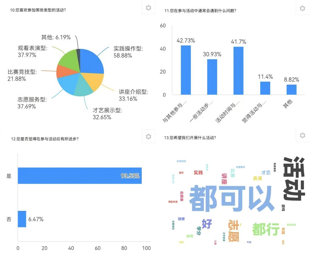 本次问卷调查旨在深入了解同学们对课外活动的参与情况、态度及其影响因素,以便为学校和相关部门提供数据支持,优化课外活动的设计和实施。通过对同学们参与课外活动的动机、频率、偏好及遇到的问题进行系统分析,我们希望能够识别出影响同学们参与度的关键因素,从而为进一步提升课外活动的吸引力和有效性的指导。